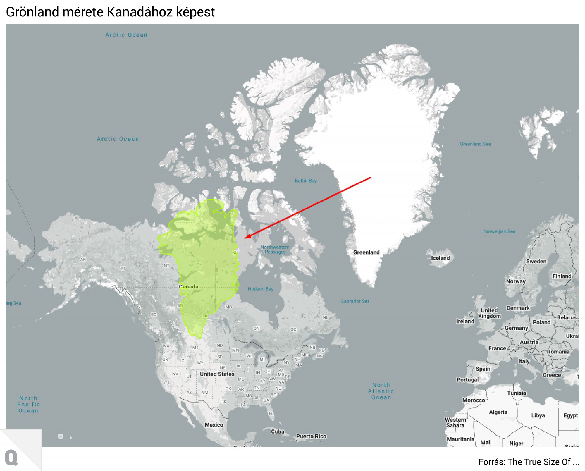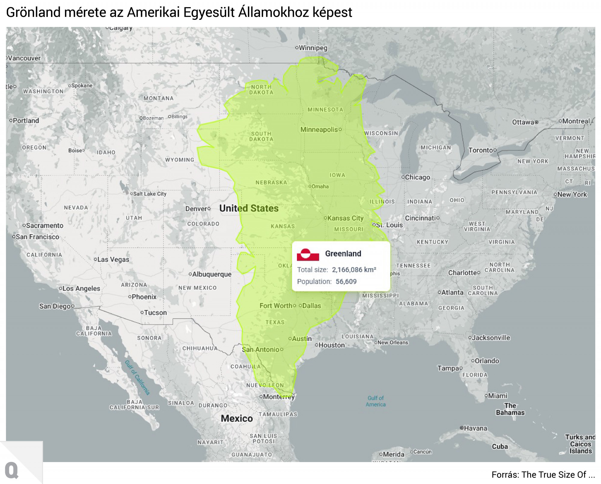 Itt már azt is láthatjuk, hogy a Grönlandra igényt tartó Egyesült Államok is négy és félszer akkora, mint a sziget, bár az amerikai Közép-Nyugatot teljesen lefedné Észak-Dakotától egészen a mexikói határig.