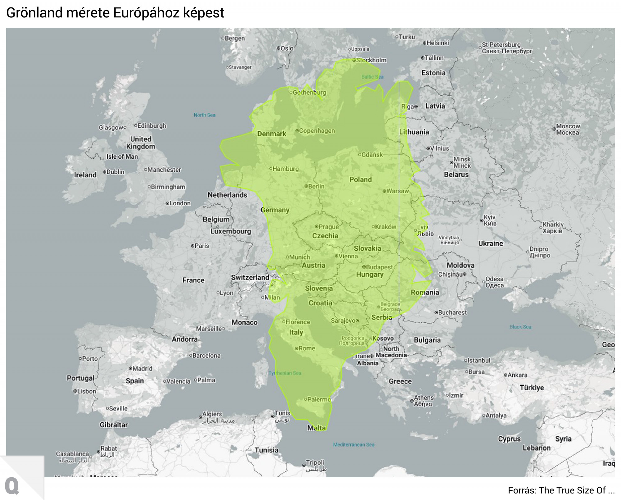 De mekkora Grönland az anyaországhoz, Dániához képest? Az egykori gyarmattartó királyság területe alig 2 százalékát teszi ki a szigetének, ám egész Európához viszonyítva is Stockholmtól Máltáig érne Grönland. A teljes Európai Unió területe kétszer nagyobb, mint Grönlandé.