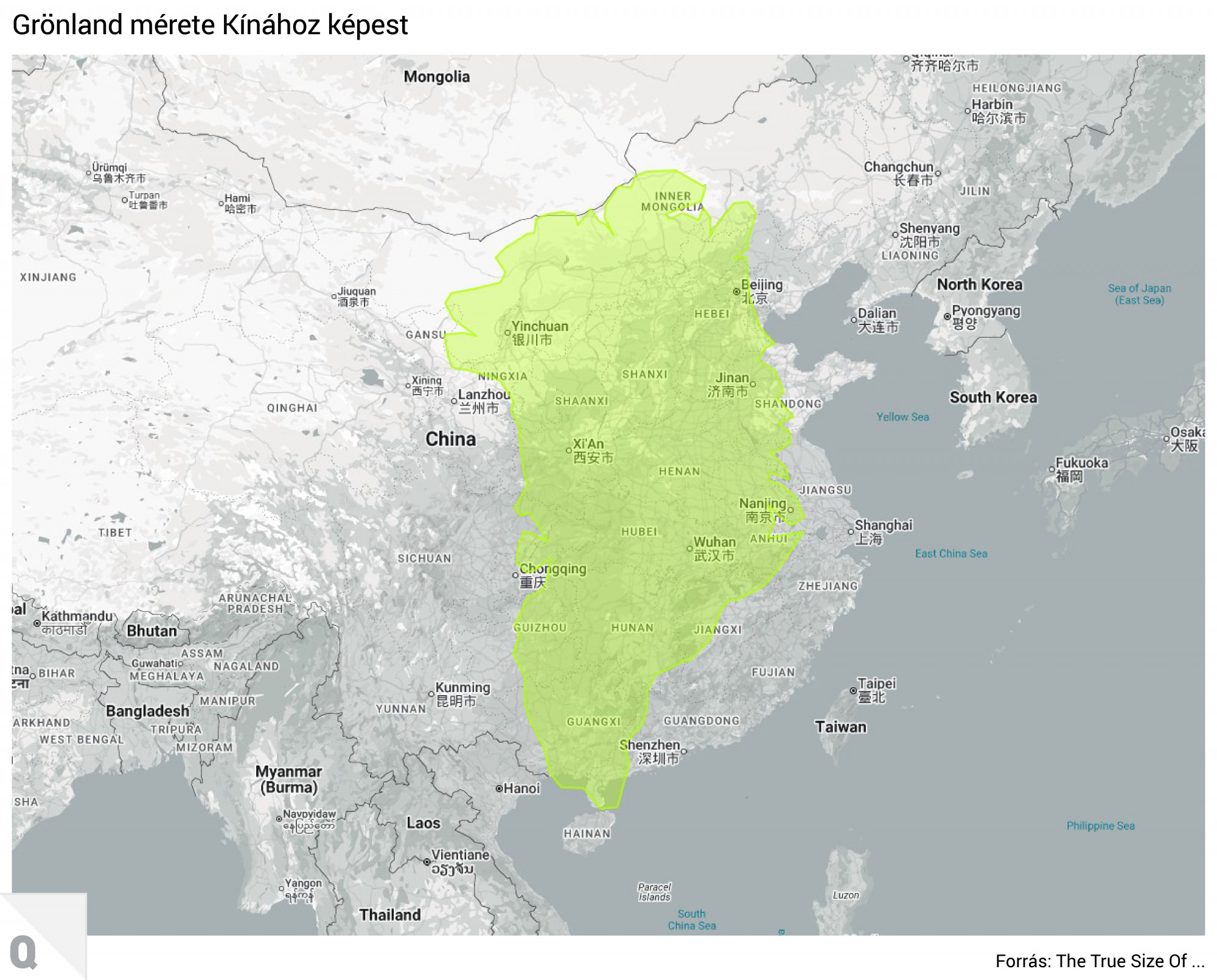 Az Egyesült Államok legnagyobb globális politikai és gazdasági ellenfele Kína, amely az előbb felsoroltak után a negyedik legnagyobb területű ország a világon. Grönland itt a legsűrűbben lakott keleti partvidéket fedné le, a mongol határtól egészen Sencsenig.