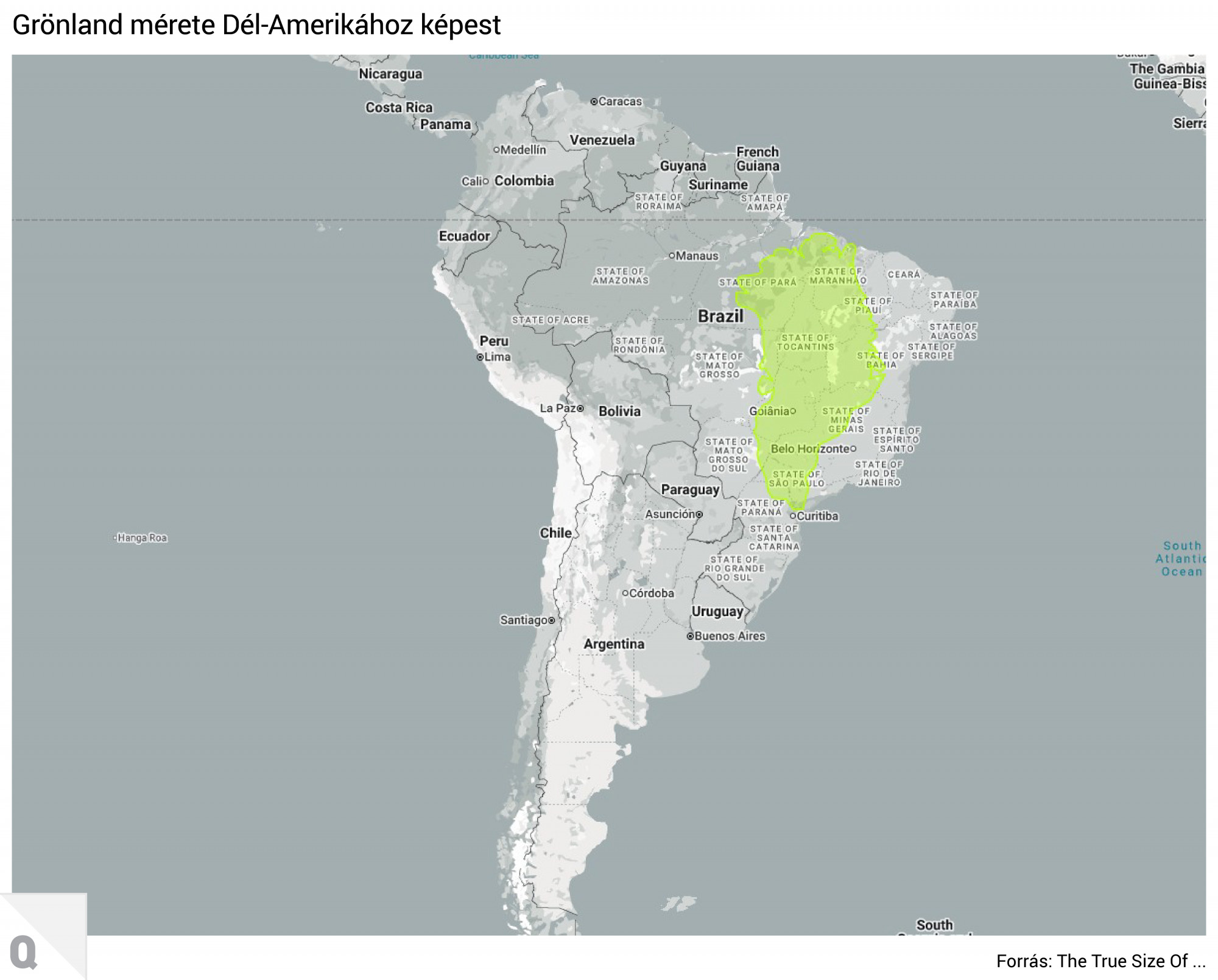 Az ötödik legnagyobb ország, Brazília majdnem négyszer akkora mint Grönland.