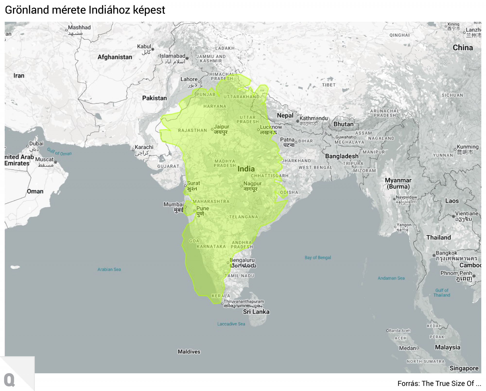 Ha pedig olyan országot keresünk, ami alakjában és méretében is összehasonlítható Grönlanddal, egy kicsit keletebbre érdemes tekinteni. Bár még India is másfélszer nagyobb, népsűrűsége pedig közel 20 000-szerese Grönlandénak, az északi sziget szinte tökéletesen lefed India 35 államából húszat.