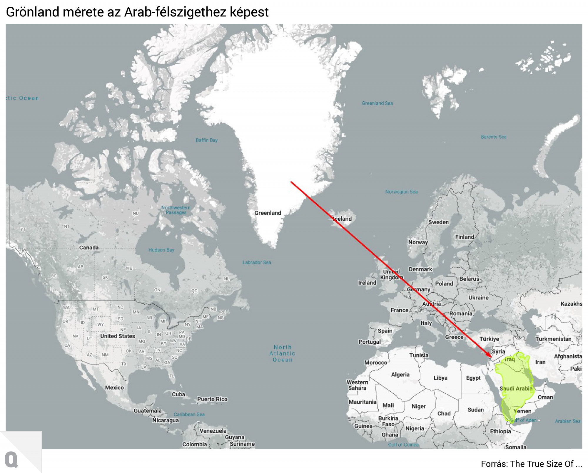 A szigetet a térképek tetején lévő nagy fehér foltként szokás ismerni, és mivel az emberek többsége még csak az atlaszban látta Grönlandot, a méretét is jócskán túlbecsülhetik. A világtérképeken általában használt Mercator-vetületen ugyanis egész Észak-Amerikánál is nagyobbnak látszik, holott valójában még az Arab-félsziget is egymillió négyzetkilométerrel nagyobb nála.