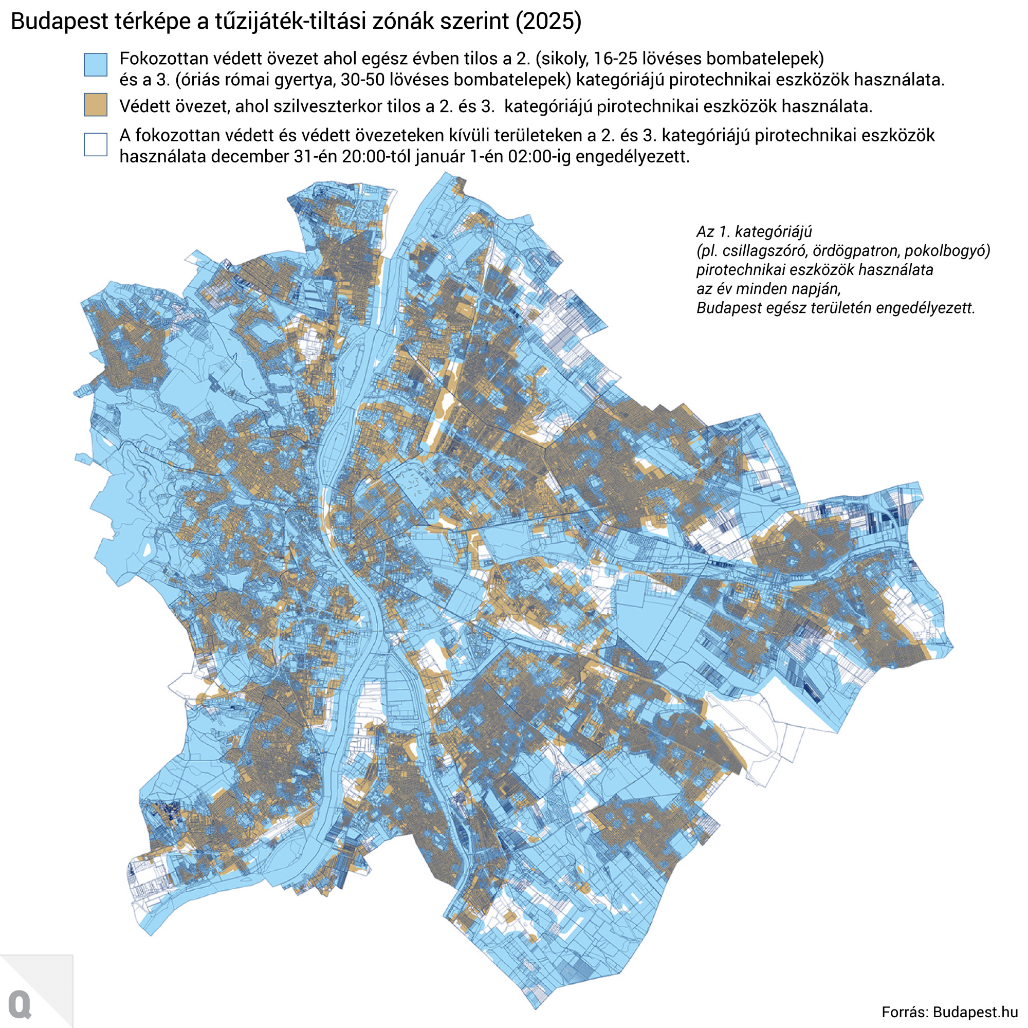 A fokozottan védett és védett övezeteken kívüli területeken (fehér színnel jelölve) a 2. és 3. kategóriájú pirotechnikai eszközök használata december 31-én este 8-tól január 1-én hajnali 2 óráig engedélyezett.