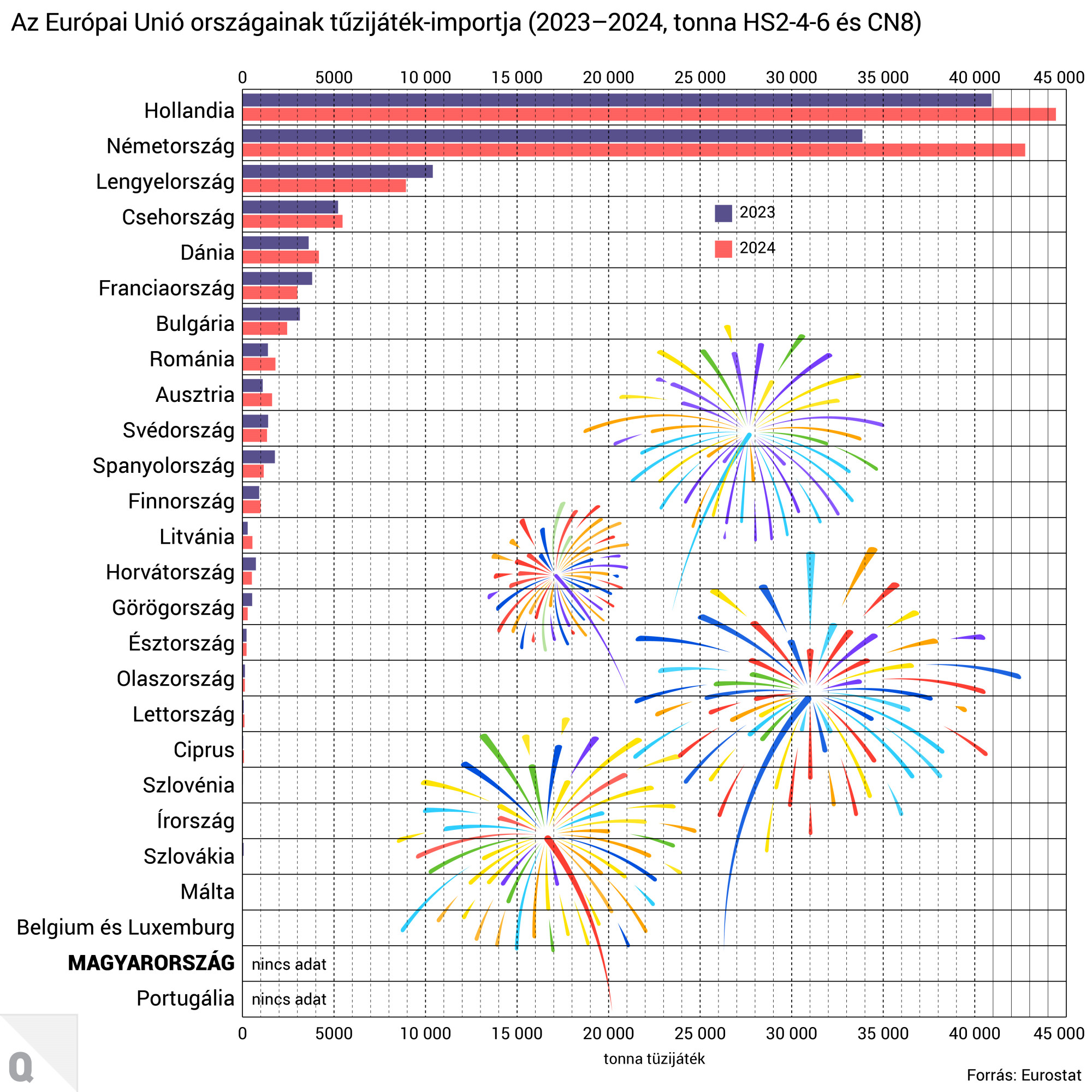 Az Eurostat friss adatai szerint 2024-ben az uniós országok cégei 120 000 tonna, 406,7 millió euró értékű tűzijátékot importáltak az EU-n kívüli országokból. Ez 9,5 százalékos mennyiségi és 21,5 százalékos értékbeli növekedést jelent 2023-hoz képest.