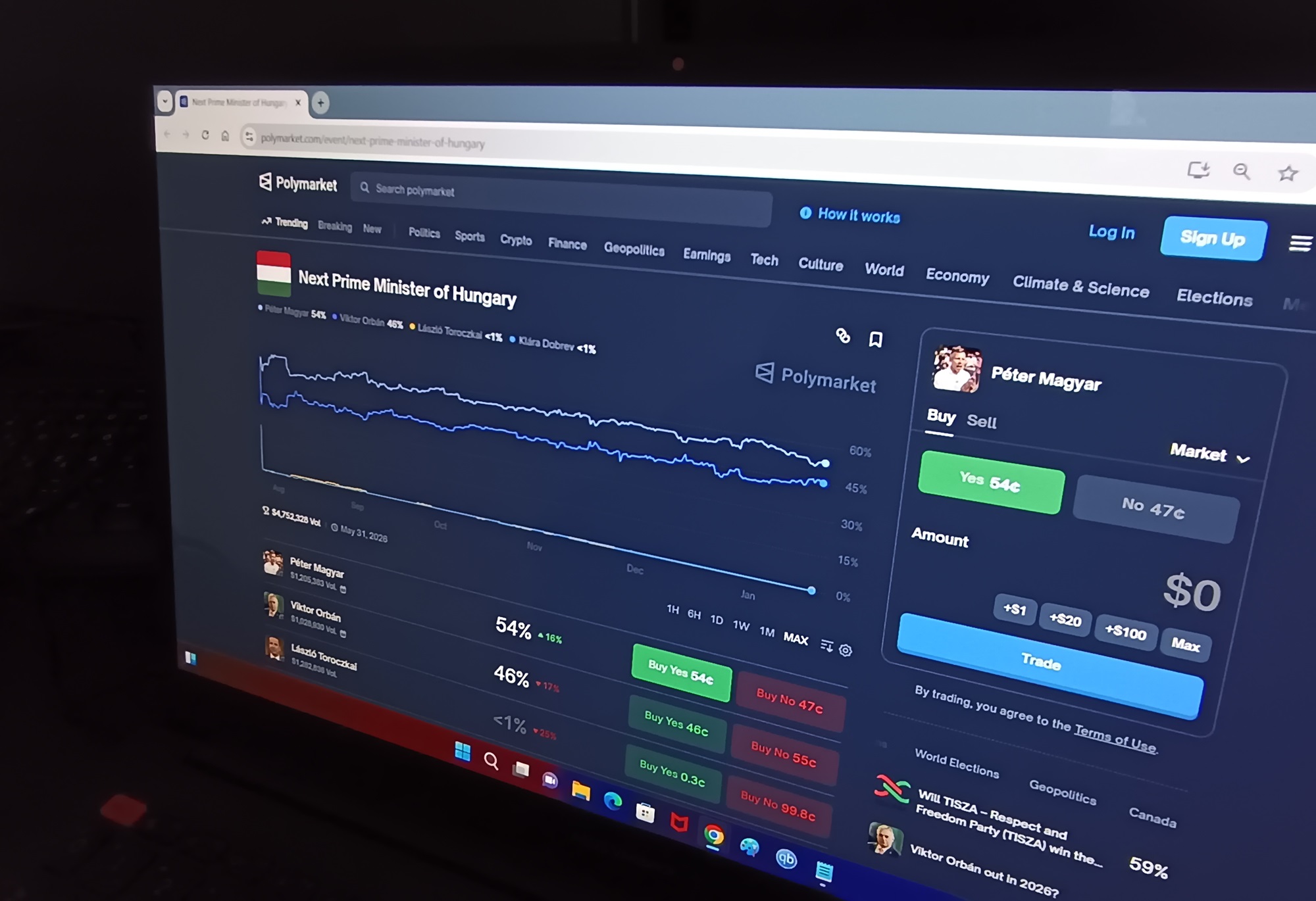 Ezért lehet érdekes Magyarországról nézve is ez az új prediktív eszköz: arra a fogadásra (vagy piacon), amely Magyarország következő miniszterelnökéről szól, már közel 5 millió dollárt tettek fel a tőzsdézők, és ezek alapján 54 százalékos esélyt adnak Magyar Péter győzelmére, míg Orbán Viktor 46 százalékon áll.