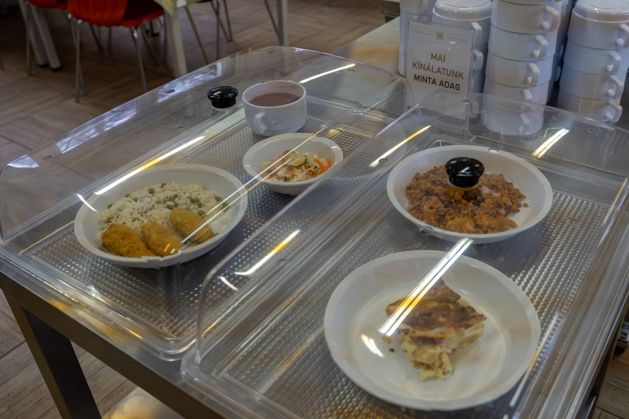A harmadik kerületi általános iskola ebédlőjében hosszú asztalok sorakoztak kétoldalt, egymás mögött 4-5 sorban, középen pedig kis melegentartó pultok álltak, levest, három különböző főételt és salátákat kínálva. A pult legelején két átlátszó, műanyag tetejű dobozban lehetett megnézni az aznapi ételek mintáját, és az ebédeltető tanár még a bejáratnál felsorolta a gyerekeknek a menüt. Az iskolások repetázhattak is, kizárólag tiszta, még nem használt tányérokba szedve az ételt, amit a diákok könnyedén be is tartottak. Pénteken, amikor mi is kipróbáltuk az iskola menzáját, paradicsomleves, csirke nuggets borsós rizzsel, tarhonyás hús és túrós cicinka (közismert nevén túrós nudli) volt terítéken. A feltehetően előfagyasztott húsnak és a köretnek is markáns íze volt, míg a túrós cicinkát nem cukrozták túl.