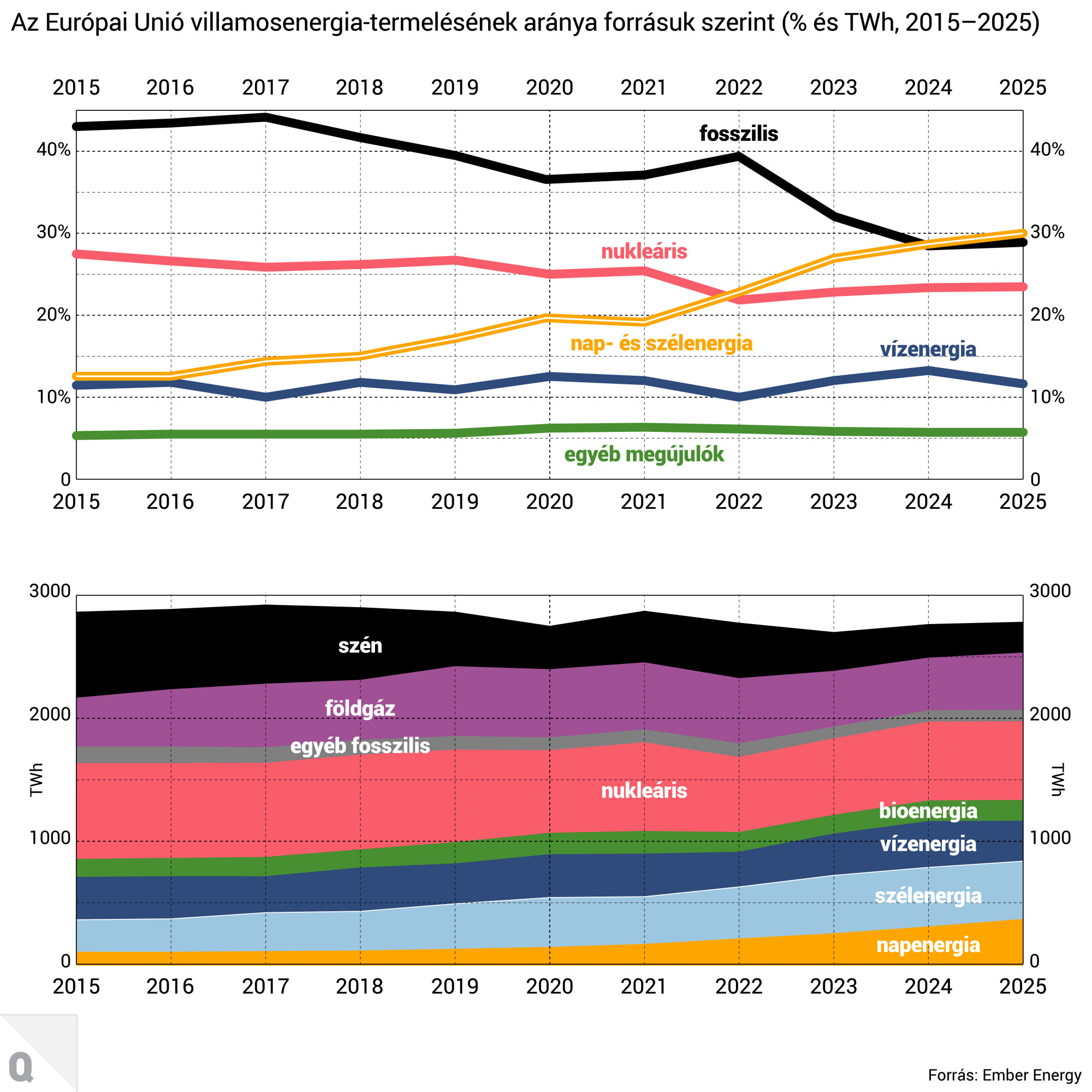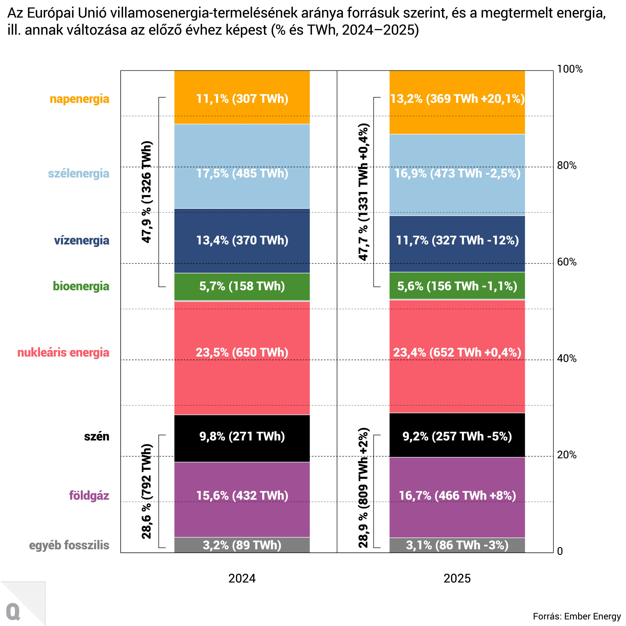 A nap- és szélenergia a napenergia kapacitásnövekedése miatt az EU energiatermelésének 30,1 százalékát tette ki tavaly, míg a fosszilis tüzelőanyagok csak annak 28,9 százalékát. A vízenergiával együtt az EU energiamixének közel felét, 47,7 százalékát megújuló energiaforrások adták – még azzal együtt is, hogy a tavalyi időjárás nem kedvezett a vízerőműveknek, így a megújulók teljes részesedése is csökkent 0,2 százalékkal az előző évhez képest.