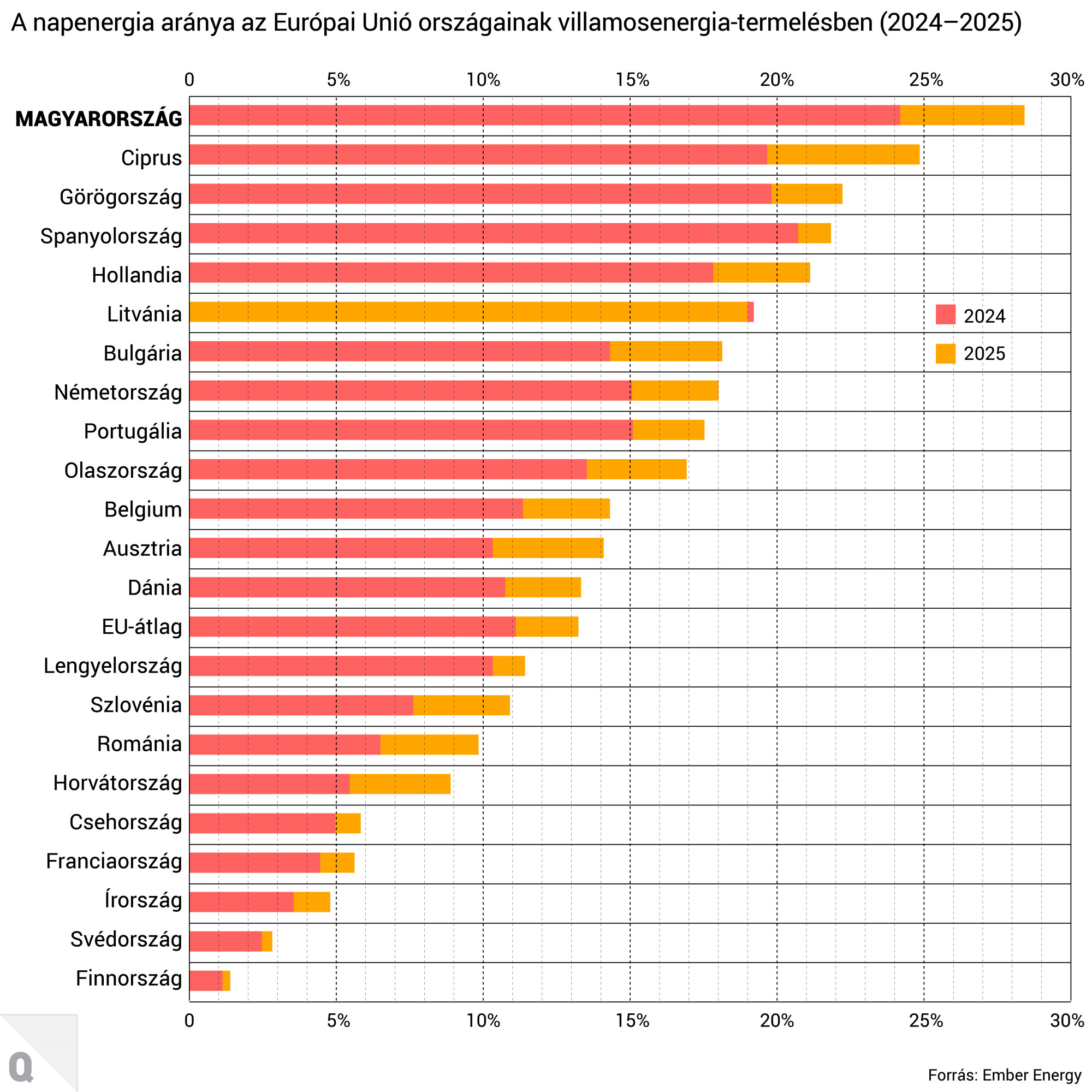 A napenergia önmagában az EU energiatermelésének 13 százalékát biztosította, és az energiamixen belüli aránya immár negyedik éve több mint 20 százalékkal nőtt. A napenergia részaránya minden EU-tagországban növekedett, és ahogy 2024-ben, úgy 2025-ben is Magyarországon tette ki a legnagyobb részét a megtermelt energiának, 28 százalékkal.