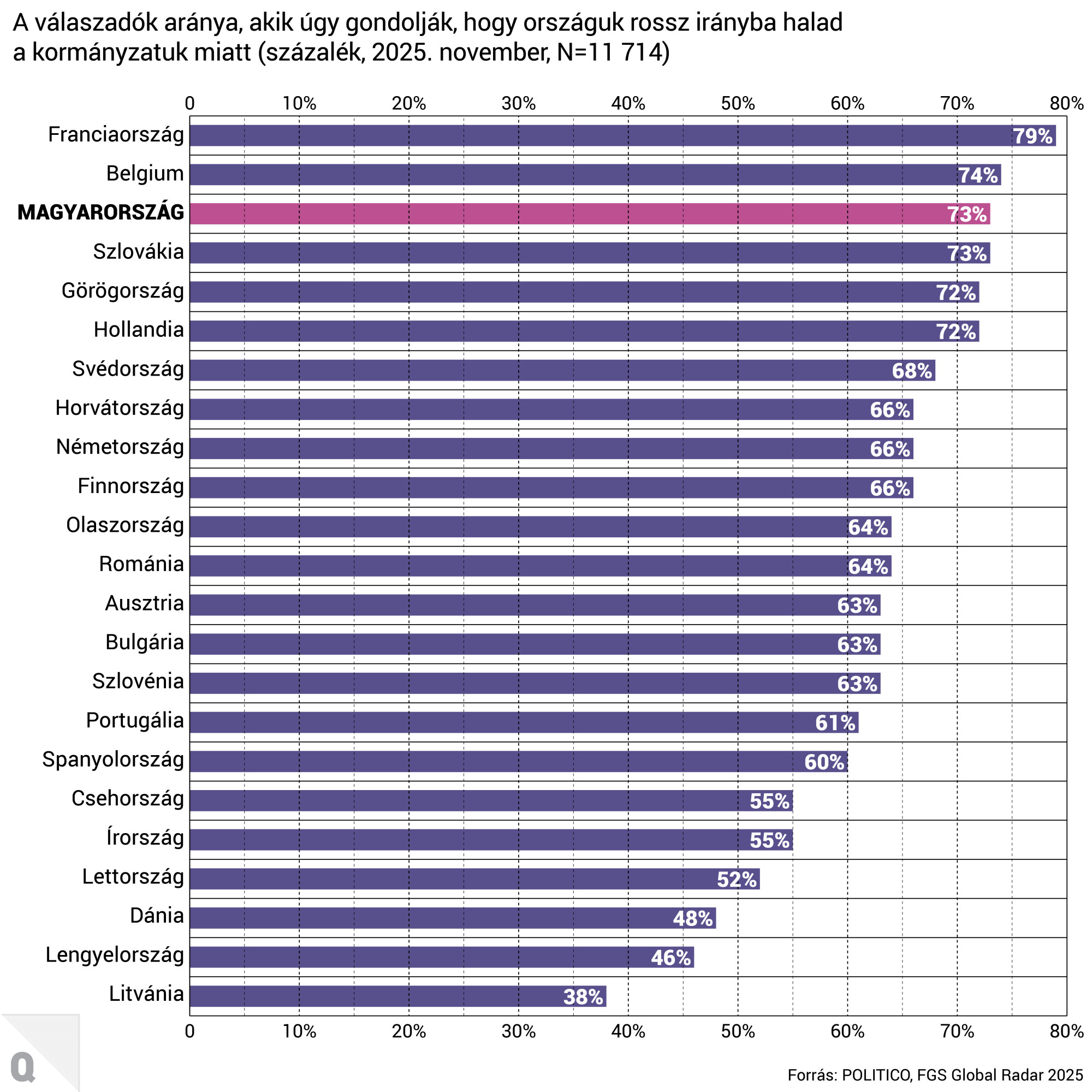 Az európaiak disztópikus jövőképe sem véletlen, hiszen az aktuális kormányzási stratégiákkal sem elégedettek: a megkérdezettek 65 százaléka úgy vélte, hogy az ország, ahol él, rossz irányba halad a kormányzati döntések miatt. Bár Lengyelország, Litvánia és Dánia állnak a leginkább orosz nyomás alatt, és nagyban függenek a keleti nagyhatalomtól, mindhárom országban a válaszadók több mint fele elégedett volt a nemzeti kormányzás minőségével. Ugyanakkor a franciák, a belgák és a magyarok a legborúlátóbbak az országok jelenlegi kormányzásával kapcsolatban; a három listavezető ország lakosságának mintegy kétharmada úgy érzi, hogy a nemzeti kormányaik a hanyatlás felé vezetik az országaikat.