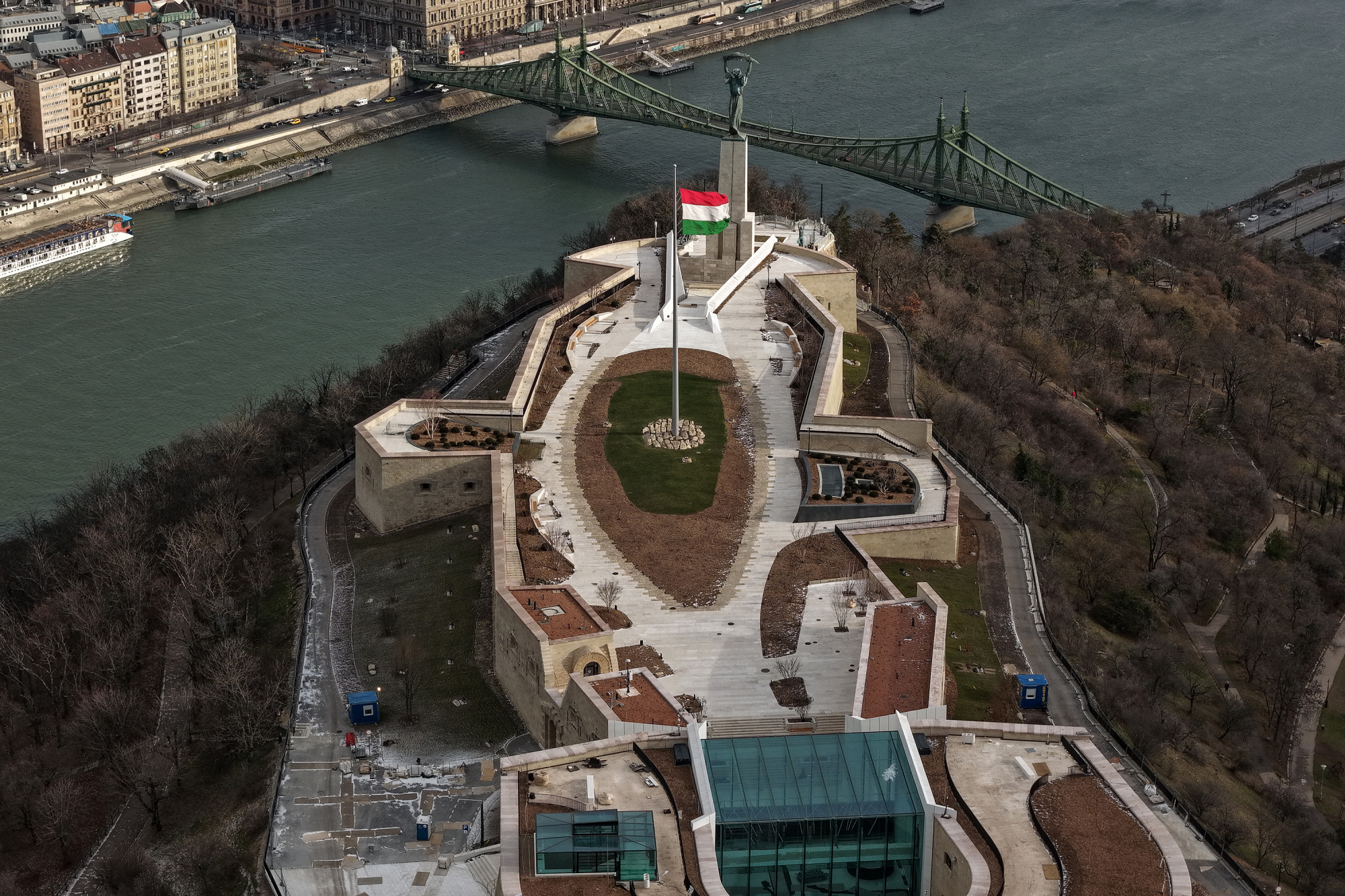 A központi zászlót azonban már nem a Szabadság téren építették fel újra (ahol 1945-ben lerombolták), hanem 2014-ben a Kossuth tér átépítése során az Országház elé került. Már a tervek is azt mutatták, hogy az állíttatók szándéka szerint a nemzeti lobogót nem lehet majd a teljes magasságig felhúzni. A körülbelül a rúd kétharmadáig felhúzható zászló így optikailag folyamatosan a teljes felvonás és a félárbóc között marad, és szimbolikus jelentése is e két lehetőség között lebeg. Lehetne mindez akár véletlen vagy dizájngondolat is (bár miért építene bárki is magasabb rudat, mint ameddig a zászlót húzhatja?), de a Kossuth téren újra felállított emlékművek rendszerében elfoglalt helyéből következően szándékos emlékezetpolitikai gesztusról van szó.