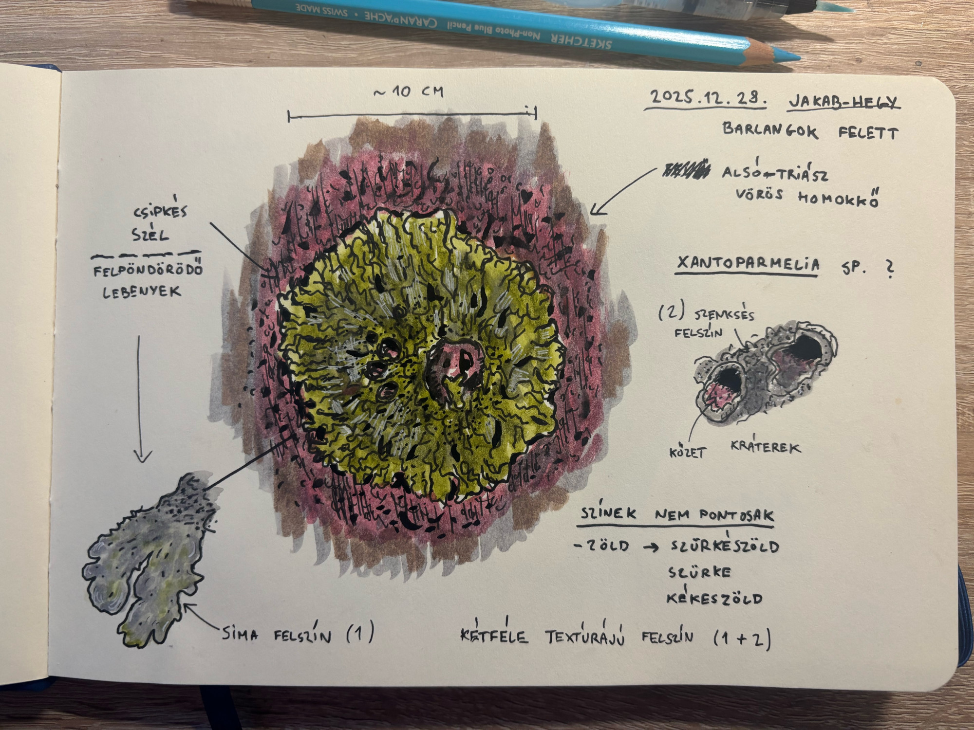 Ahogy a Jakab-hegyen egy hideg decemberi napon a sziklán kuporogva a vörös homokkövön élő zuzmót rajzolom, nemcsak a testhelyzet szokatlan, hanem a figyelem iránya is. Általában madarakat, tehát széles körben kedvelt, karizmatikus gerinceseket figyelek és rajzolok a terepi naplómba. A zuzmókhoz közel hajolva a Jakab-hegy új világa tárul fel előttem, ahogyan a gazdagon burjánzó szürkészöld telepekre összpontosítok. Ez valóban filozófiai gyakorlat, nem a szó szűkebb, akadémiai, hanem a tágabb, az eredeti antik jelentéséhez sok szempontból közelebb álló életfilozófiai értelemben. Az évi néhány millimétert növekvő, talán velem egykorú zuzmó a táj, a tér és az idő és a benne élő organizmusok másfajta észlelésére tanít. Nem egy absztrakció, nem egy fajnév, hanem a tájban velem együtt létező, velem együtt lélegző, velem evolúciós rokonságban álló nem-emberi lakótárs. Az ökológiai válság nem pusztán ott kint, grafikonokkal és elméleti modellekkel leírhatóan történik, hanem itt, az élőhelyeinkben és életszokásainkban – és csak akkor lesz belőle valódi felelősség, ha ezt lakótársakként is képesek vagyunk érzékelni.
