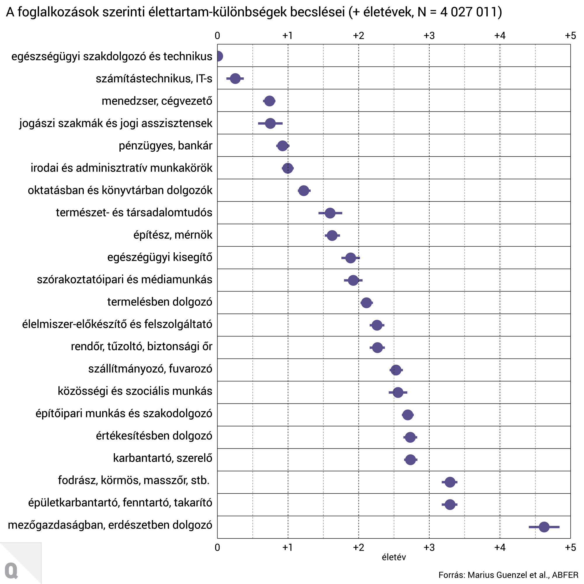 A vizsgálat szerint a legkedvezőbb életesélyekkel a mezőgazdaságban, a halászatban és az erdészetben dolgozók rendelkeznek. Ebben a csoportban az élettartamelőny 4,5–5 év, ami kiugróan magas a teljes mezőnyhöz képest. Ezt követik az épülettakarítással és -karbantartással foglalkozók, valamint a személyes törődéssel kapcsolatos foglalkozások, amelyeknél nagyjából 3 évnyi előny figyelhető meg.