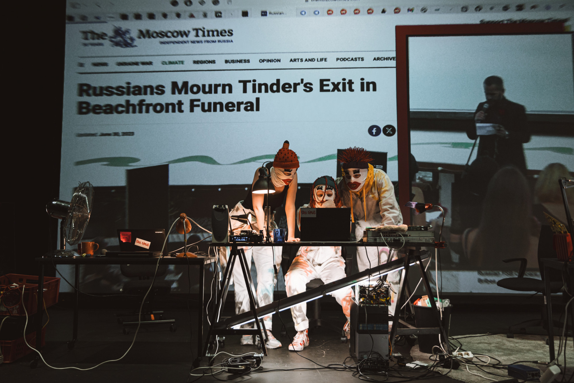 Két éve februárban, az észtországi Narva városában debütált egy színházi előadás, amely egyszerre performansz, radikális kiberaktivizmus, technológiai bravúr – és nem utolsó sorban egy gyilkos rezsimmel szembeni vádirat. Először talán a Spy Girls című előadás nézői sem lehettek biztosan abban, hogy amit látnak, az minden pillanatában eleven és valódi-e, nem pedig kitalált és megrendezett események láncolata. Pedig eleven és valódi: az alkotók egy randiapplikációt működtettek élőben a színpadról. Az orosz Telegramra fejlesztett fake randiapp, illetve hamis női profilok segítségével már hosszabb ideje kapcsolatban álltak orosz katonákkal, az előadás során pedig élőben szövődnek tovább ezek a virtuális viszonyok. Három maszkos, a kilétét eltitkoló szereplő a színpadról működteti a teljes technológiai apparátust, és ott helyben teszi a közönséget a felkavaró és felforgató akció részesévé. Hívják a „partnereiket”, és beszélgetnek velük.