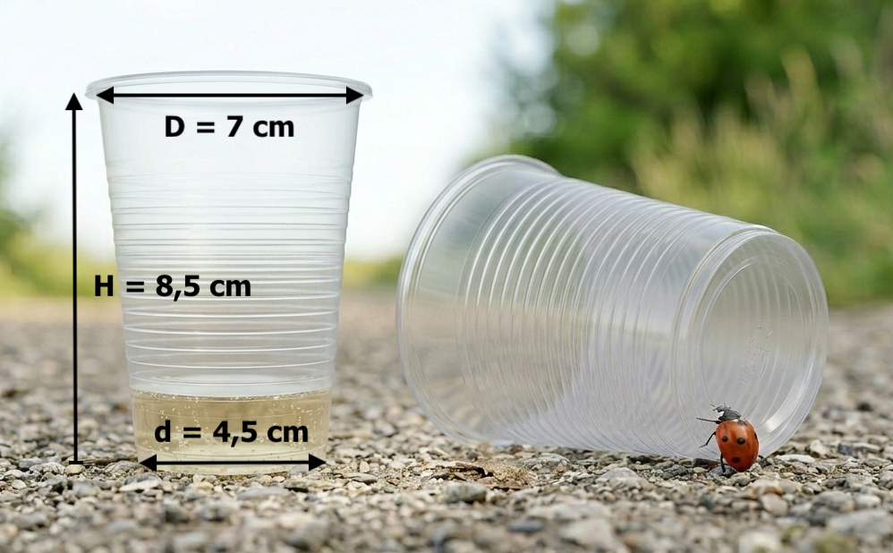Egy műanyag pohár fekszik a vízszintes földön. Egy katicabogár érkezik a pohár talpának legalsó (földön fekvő) pontjához, ahonnan a legrövidebb úton szeretne a pohár legmagasabb pontjára jutni. Milyen hosszú utat tesz meg, ha a pohár talpának átmérője d = 4,5 cm, a pohár peremének átmérője D = 7 cm, és a pohár magassága álló helyzetben H = 8,5 cm? Tegyük fel, hogy a pohár csonka kúp alakú, sima felülettel, a katicabogár pedig pontszerű.