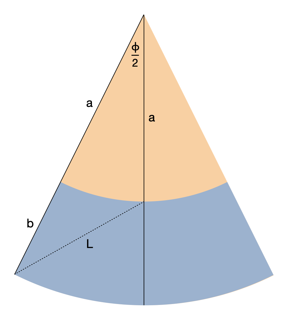 Ezután használjuk ki azt, hogy a kúpok és csonka kúpok palástja síkba teríthető. Ez könnyen belátható, ha fordítva gondolkodunk, vagyis belátjuk, hogy egy papírlapból kivágott körcikkből kúpot tudunk tekerni, egy körgyűrű cikkből pedig, mint amilyen az alábbi ábrán is látszódik kékes színnel, csonka kúpot. A kérdés az, hogy mik ennek a körgyűrű cikknek a paraméterei.