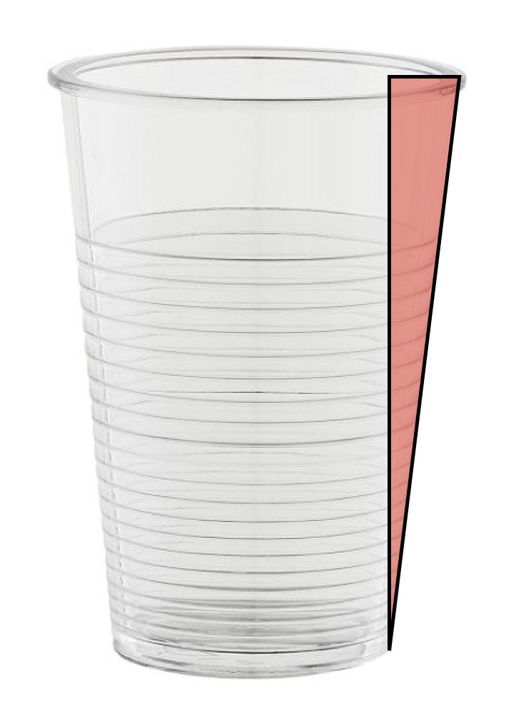 Először számítsuk ki a pohár oldalának hosszát, azaz a csonka kúp alkotóját, amit nevezzünk b-nek. Ezt az ábrán látható piros háromszög segítségével kaphatjuk a b2 = H2 + (D/2-d/2)2 összefüggésből (Pitagorasz-tétel), és b ≈ 8,6 cm adódik.