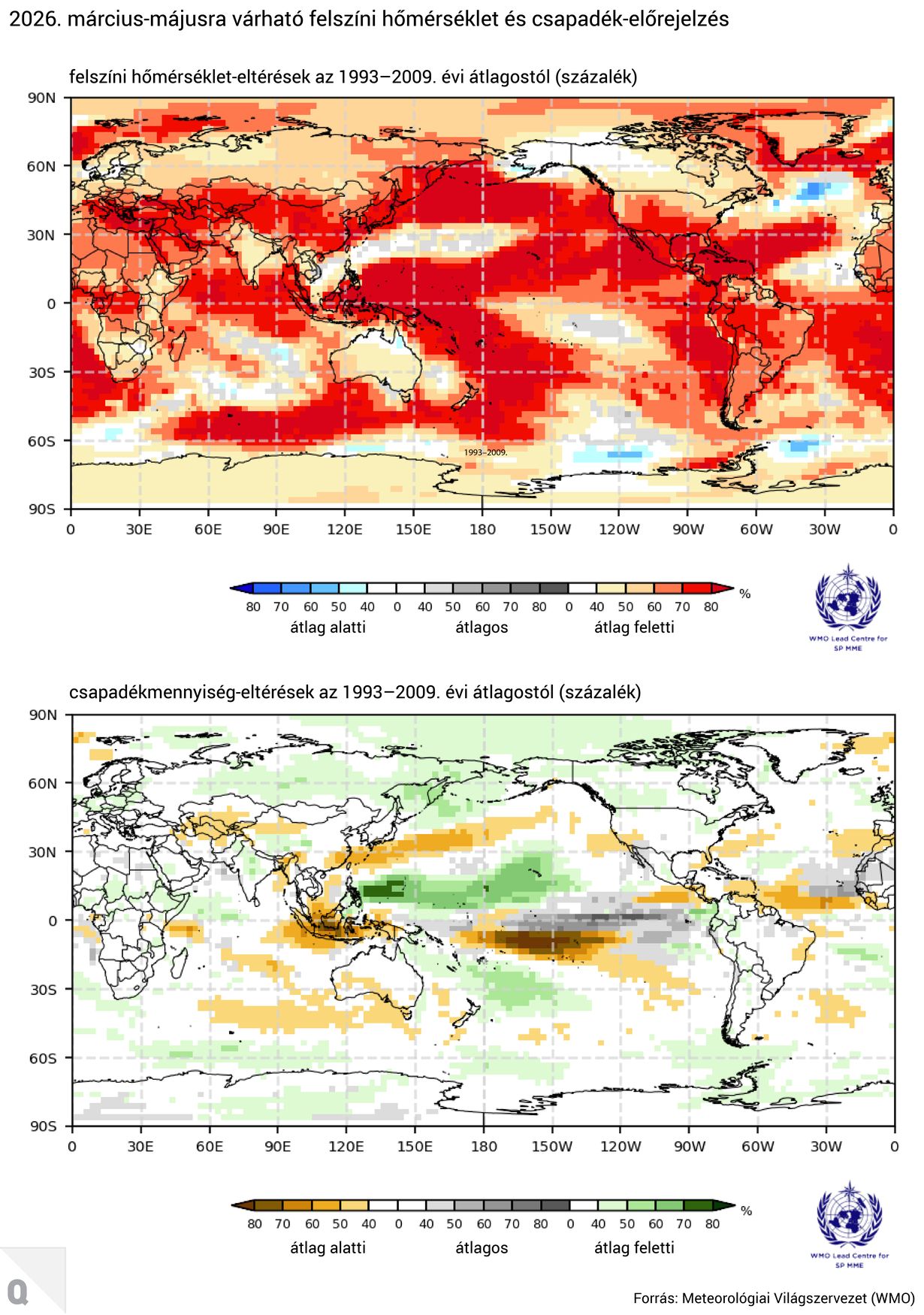 Az átfogóbb éghajlati kilátások biztosítása érdekében a WMO rendszeresen kiad Globális Szezonális Éghajlati Frissítéseket (GSCU) is. A frissítések a felszíni hőmérséklet és a csapadék globális és regionális anomáliáit, valamint azok alakulását a következő évszakban is figyelemmel kísérik. A legfrissebb frissítés szerint 2026 márciusától májusáig széles körben elterjedt globális esélye van az átlag feletti szárazföldi felszíni hőmérsékleteknek. Az egyenlítői Csendes-óceán térségében a csapadék-előrejelzések tartós La Niña-szerű mintázatot mutatnak, de a világ más részein vegyesebb a kép.