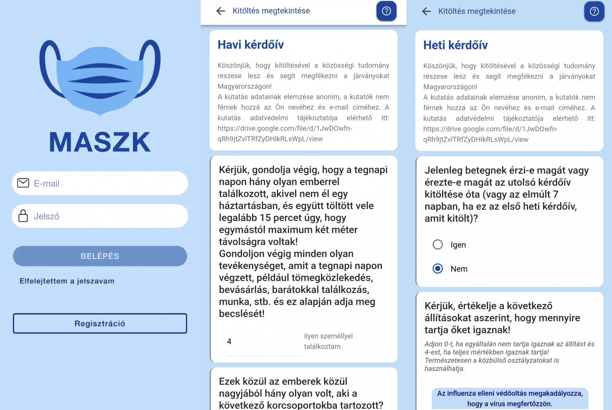 Miután a kezdő kérdőívvel végeztünk, a már sokkal rövidebb, néhány perc alatt kitölthető havi és heti kérdőívekkel találkozunk. A havi kérdőívekben a kontaktmátrixokra kíváncsiak, vagyis arra, hogy egy adott korcsoportból valaki hány emberrel és milyen időközönként találkozott különböző szituációkban, például az iskolában vagy munkahelyen. A heti kérdőívben pedig arról kérdezik a résztvevőket, hogy az adott héten az elmúlt hét napban betegnek érezték-e magukat, és ha igen, akkor milyen tüneteik voltak, végeztek-e tesztelést, és jártak-e orvosnál.