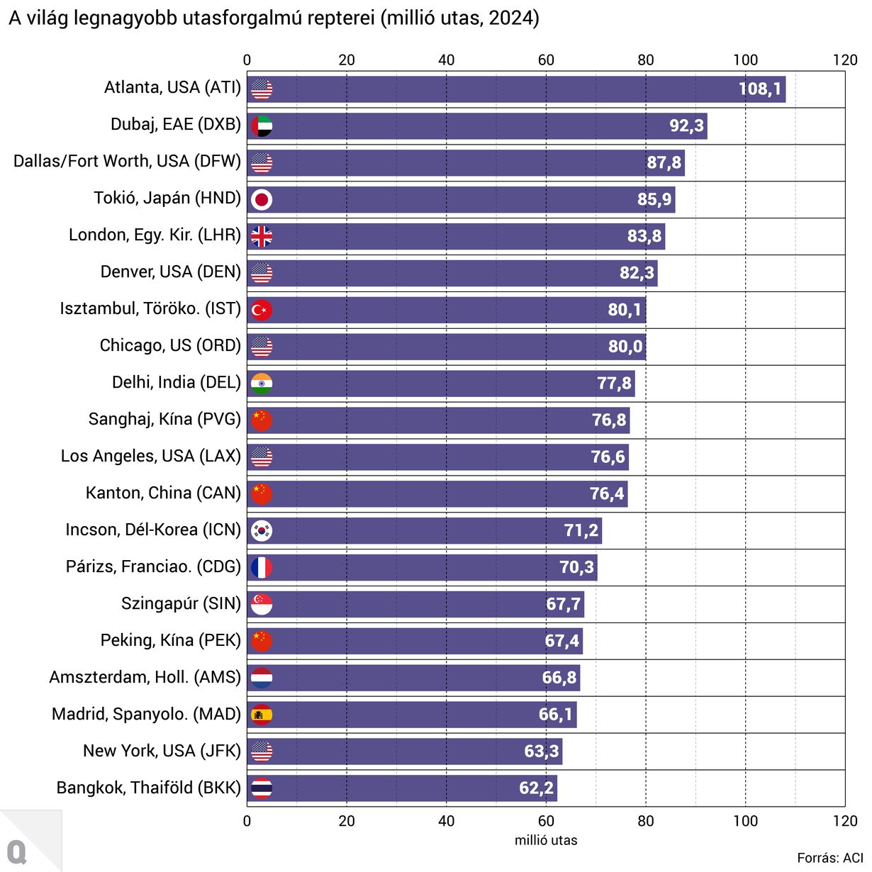 Ugyan a világ legnagyobb utasforgalmú repterei közül több is az Egyesült Államokban van, de ezek főleg belföldi utasokat szolgálnak ki.