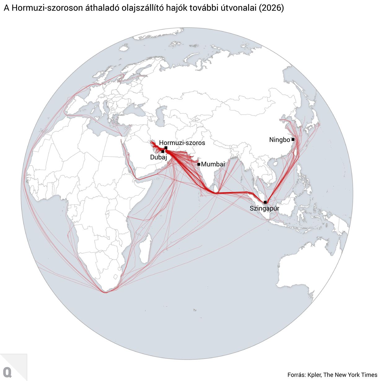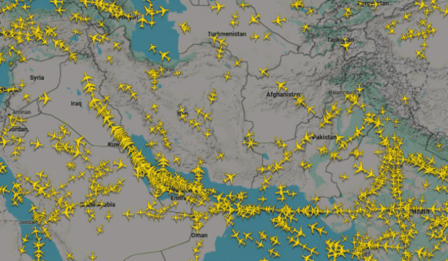 A reptereket összekötő világtérképen látszik igazán, hogy a Közel-Kelet – főleg a Perzsa-öböl hubjai – a világ egyik legfontosabb átszálló régiója, ezért a lezárások miatt rengeteg Európa–Ázsia, Európa–Ausztrália és Afrika–Ázsia útvonalat át kellett terelni.