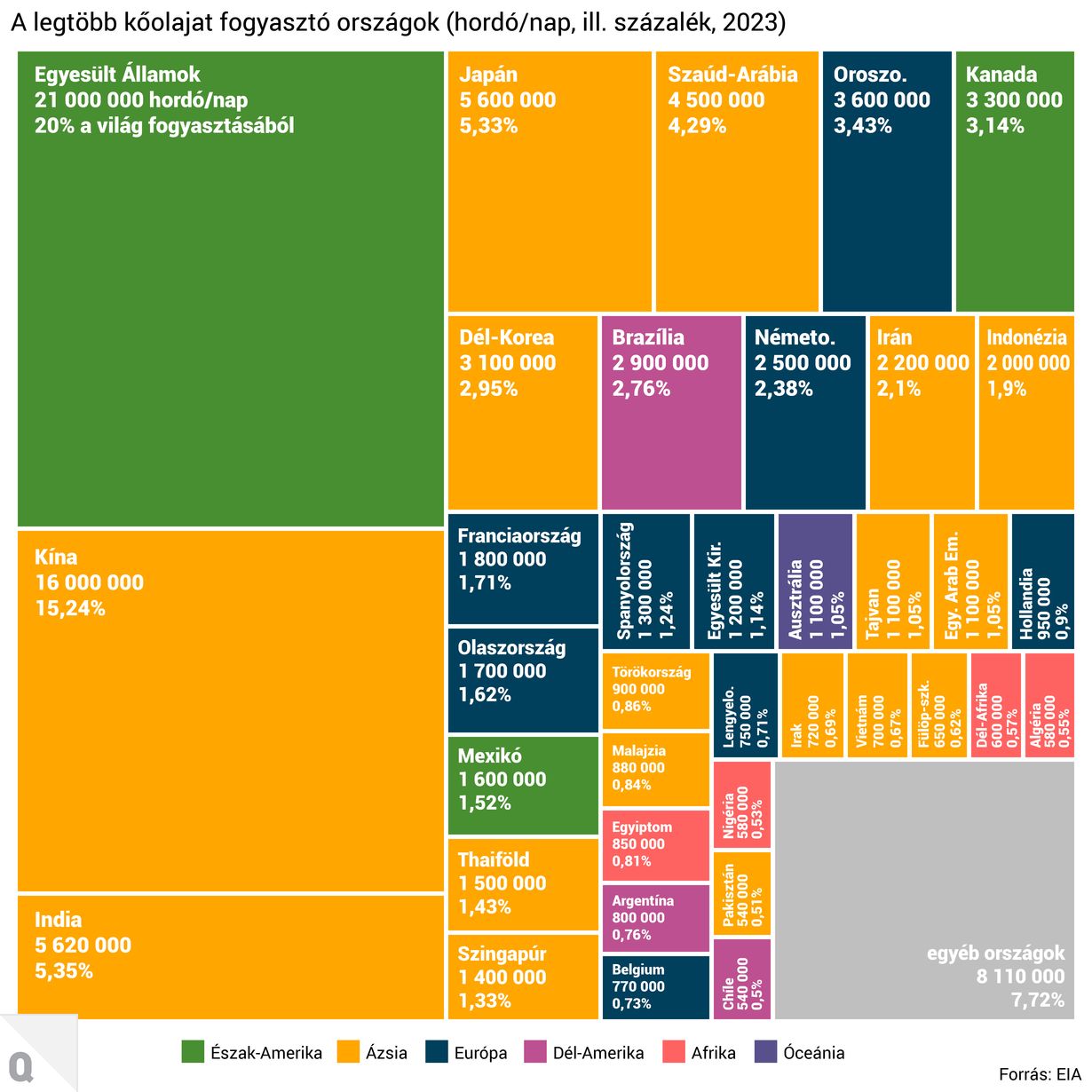 A legtöbb kőolajat fogyasztó országok közül az USA a palaolaj-forradalommal a legnagyobb termelő is, de így sem fedezi a világfogyasztás ötödét kitevő kőolaj-éhségét; a szintén energiaéhes Kína, India, Japán és Dél-Korea erősen függ a közel-keleti szállításoktól.