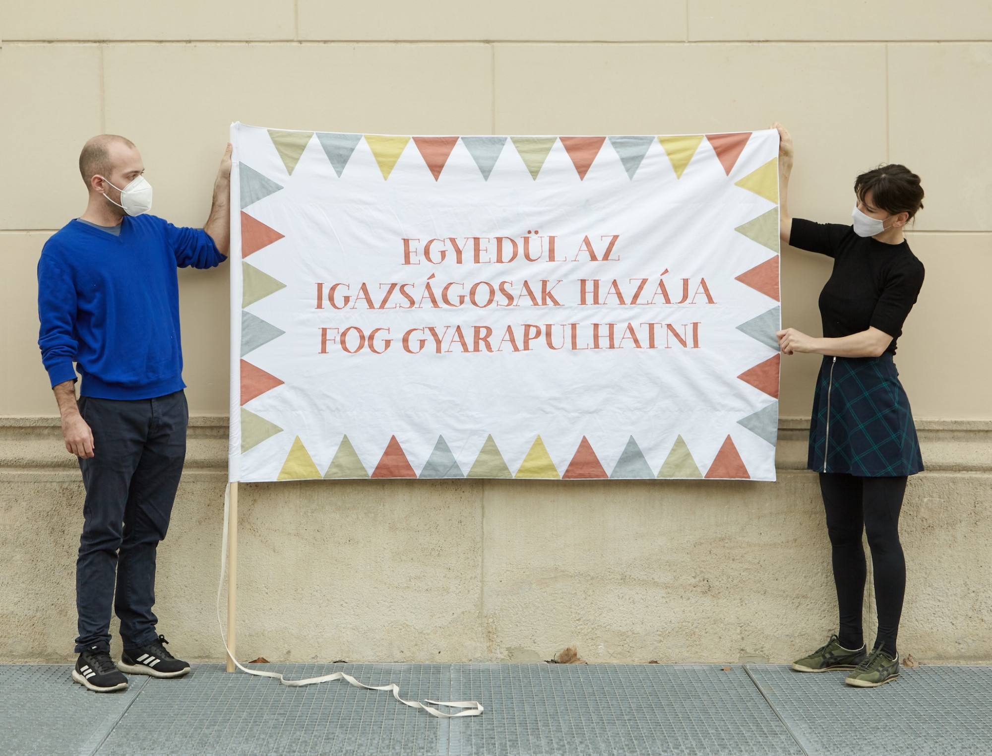 A projekt keretében elkészült egy zászló, amely akár ennek az elképzelt szigetországnak a lobogója is lehetne, a farkasfog motívum a 48-as zászlókat idézi, rajta a nemzetiségeket szimbolizáló színek és jelek, valamint egy töredék Széchenyi Istvántól: „egyedül az igazságosak hazája fog gyarapulhatni”. A félmondat az Akadémia közgyűlésén, még 1842-ben elhangzott nagyívű beszédéből való, amelynek központi témája tulajdonképpen a nemzetté válás kérdése, és előkerül benne a magyarok és más nemzetiségek viszonya is.