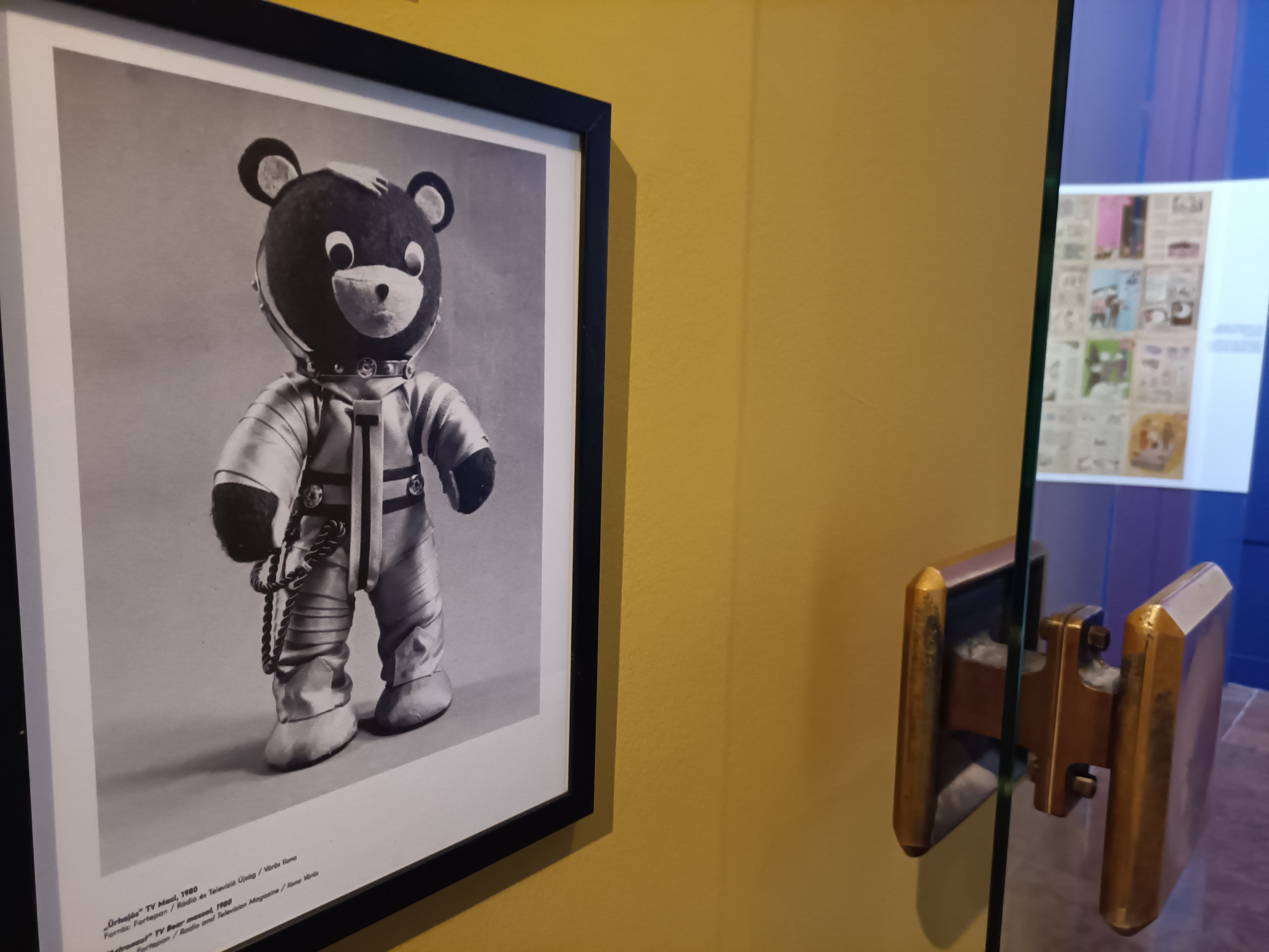 Nem is csoda, hogy a mászóka után az egyik első dolog, amivel szembetalálja magát a látogató, Sunyovszki Szilvia és Papp János a Pirx kalandjaiból, egy szkafanderes tévémaci, illetve egy tematikus válogatás a Ludas Matyi űrügyi karikatúráiból. Ebben olyan gyöngyszemek is találhatóak, mint az a kép 1959-ből, amin valaki egy magazinban a csajokat nézi, valaki más pedig azzal dicsekszik neki, hogy ez még semmi, neki felvételei vannak a Hold hátsó feléről. Eddigre már az is világossá válik, hogy itt gátlástalan nosztalgiatúra indul: a tájékoztató szövegek címei a Galaktika magazinban használt betűtípusával készültek, a karikatúrák után pedig már ismerősebb tárgyak és képek következnek, még ha maguk az egyes darabok gyakran már nem is feltétlenül személyes ismerősök.
