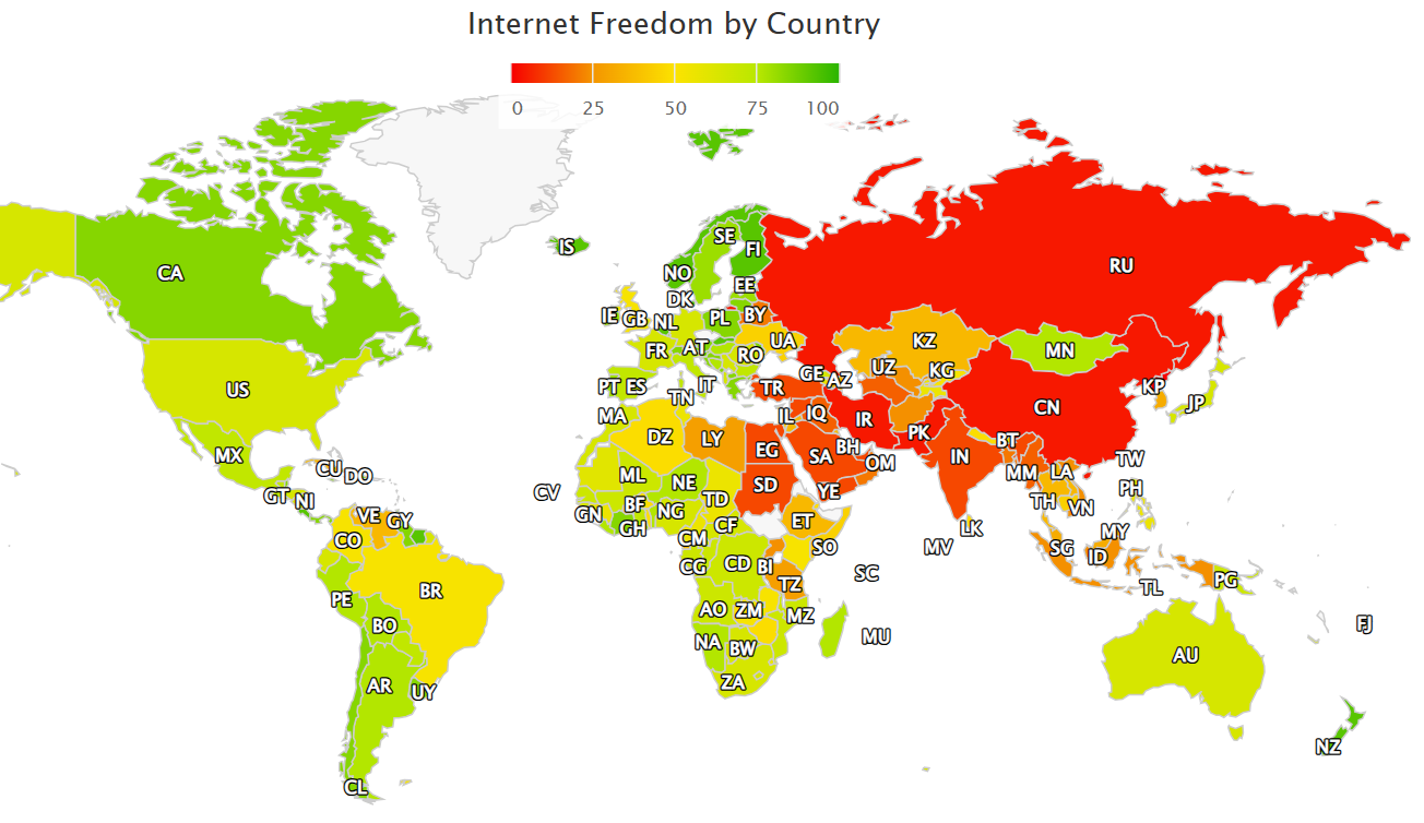 Magyarország 76 ponttal Boszni-Hercegovinával, illetve a 72 pontot szerzett Olaszországgal, Spanyolországgal és Bulgáriával azonos kategóriába került. Ez azt jelenti, hogy Magyarországon a torrent használatát, a közösségi média és a politikai, illetve civil véleménynyilvánítást korlátozzák, ugyanakkor a felnőtt tartalmak és a VPN-ek legálisan elérhetők. Ennél rosszabbul teljesített az Egyesült Államok 64 ponttal, amivel Dél-Afrikával, Japánnal és Ausztráliával került azonos kategóriába. A tanulmány szerint bár a bizonyos mértékű online szabályozások segíthetnek a gyűlöletbeszéd és a dezinformáció terjesztésének visszaszorításában, több ország törvényei is sérthetik a felhasználók alapvetők jogait.