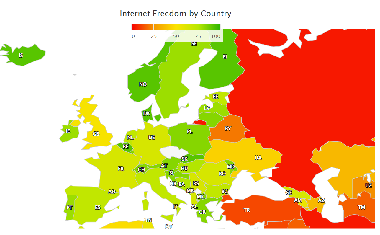 A lista első tizenegy országa között hét európai szerepel – Finnország, Izland, Norvégia, Belgium, Dánia, Szlovákia, Liechtenstein – amelyekben szabadon hozzáférhetők a felnőtt tartalmak, közösségi platformokhoz és VPN-ek, illetve a politikai és civil véleménynyilvánításra sem vonatkoznak korlátozások. Ugyanakkor még a liberális internetpolitikát folytató európai országokban sem legális a torrent használat: maga a technológia nem tiltott, de a szerzői jogokkal védett tartalmak letöltése illegális. Európában Fehéroroszország teljesített a legrosszabbul az internetes szabadság terén: bár az Instagram és a Facebook is elérhető az országban, a regnáló hatalmat kritizáló felhasználókat gyakran őrizetbe is veszik – olvasható a kutatásban.