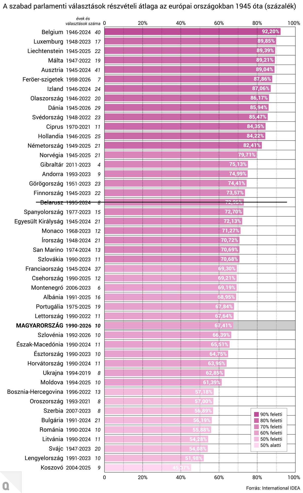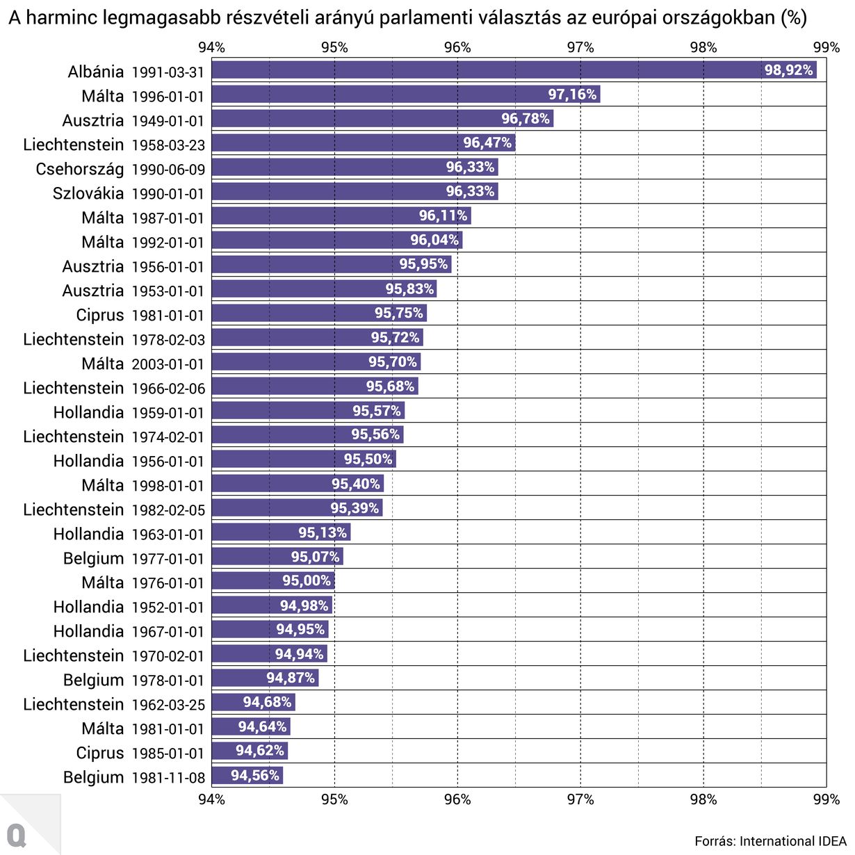 Az április 12-i magyar országgyűlési választás 79,55 százalékos részvételi aránya ugyan hazai rekord a rendszerváltás után megrendezett parlamenti szavazások között, de a fasorban sincs az európai országok parlamenti választásainak toplistájához képest. Mint az alábbi ábrából kiderül, ahhoz, hogy az ország bekerüljön az 1945 óta megrendezett nemzeti választások részvételi rangsorának első harminc helyezettje közé, legalább 94% feletti részvétel kellett volna.