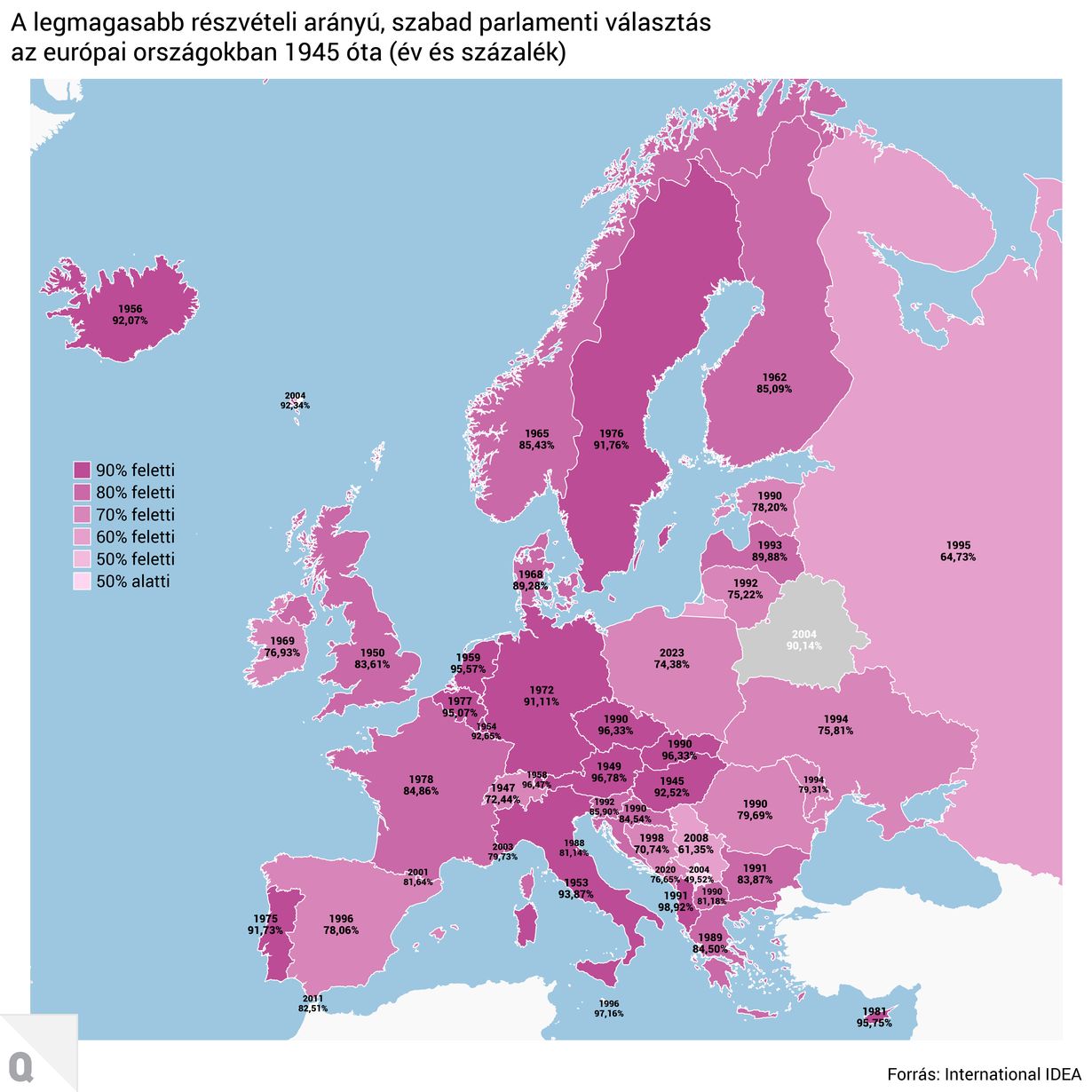 1945 óta az európai demokráciák többségében stabilan magas a részvétel, de markáns és tartós szakadék látszik az észak‑nyugat-európai országok és a kommunista utódállamok között. Az IDEA statisztikáiban az látszik, hogy a parlamenti választásokon Belgiumban vagy Svédországban évtizedek óta szinte mindenki szavaz, míg a volt kommunista országok jelentős része tartósan közepes vagy kifejezetten alacsony részvétellel működteti demokráciáját. A skandináv országokban hagyományosan konszenzusos, kompromisszumos politikai kultúra alakult ki, erős a koalíciós kormányzás hagyománya, míg a kommunista utódállamokban gyakori jelenség a politikai polarizáció, élesebbek az olyan törésvonalak, mint a bal-jobb, a nemzeti-kozmopolita, a vidék-város vagy az EU-párti-szeptikus ellentét.