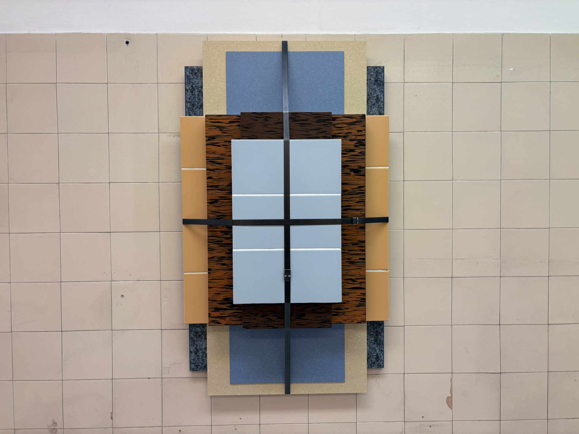 A rendelő mint fizikai valóság és hűlt hely egyszerre: Andreas Fogarasi a bécsi Allgemeines Krankenhaus helyén állt, lebontott intézet gyermekradiológiai központjának építőanyagait szedte össze, és ezekből formált kompozíciókat, mintha csak egy épület fizikai archiválásán dolgozna. Ez most egy másik rendelő csempéin jelenik meg, a budapesti Franzstadtban, és az eltérő rendszereken túl valamiképp felidézi a szemlélőben a közös monarchiabeli múltat is.
