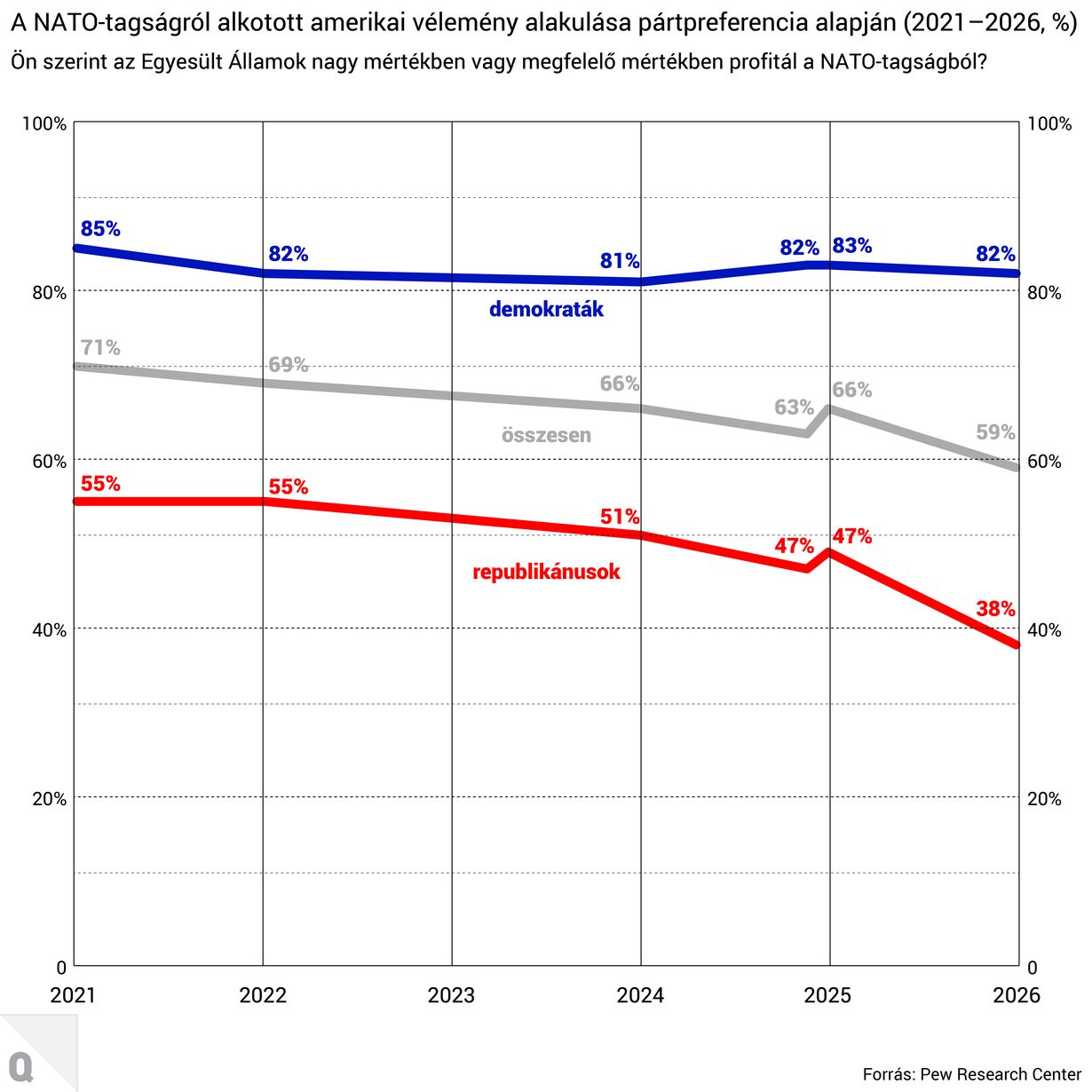A jogi és politikai háttér mellett nem elhanyagolható a közvélemény álláspontja sem. A NATO ugyanis továbbra is népszerű az amerikaiak körében, bár a tavalyi statisztikákhoz képest a támogatók aránya megcsappant. A Pew 2025-ös felmérése szerint a válaszadó amerikaiak 66 százaléka szerint az USA profitál a NATO-tagságból, míg 32 százalék ennek az ellenkezőjét gondolta, ugyanakkor a 2026 áprilisi felmérés szerint a támogatók aránya tovább csökkent 59 százalékra. A Pew szerint az utóbbi öt évben erősen pártpreferencia alapú vélemények alakultak ki a NATO-tagsággal kapcsolatban. 2025-ben a válaszadó demokraták 83, míg a republikánusok 49 százaléka vélekedett pozitívan az USA szövetségi tagságáról, idén azonban tovább nyílt az olló a két politikai oldal szavazói között: a demokraták szinte változatlanul 82 százaléka, a republikánusoknak viszont csupán a 38 százaléka látja kamatozónak az Egyesült Államok NATO-tagságát.