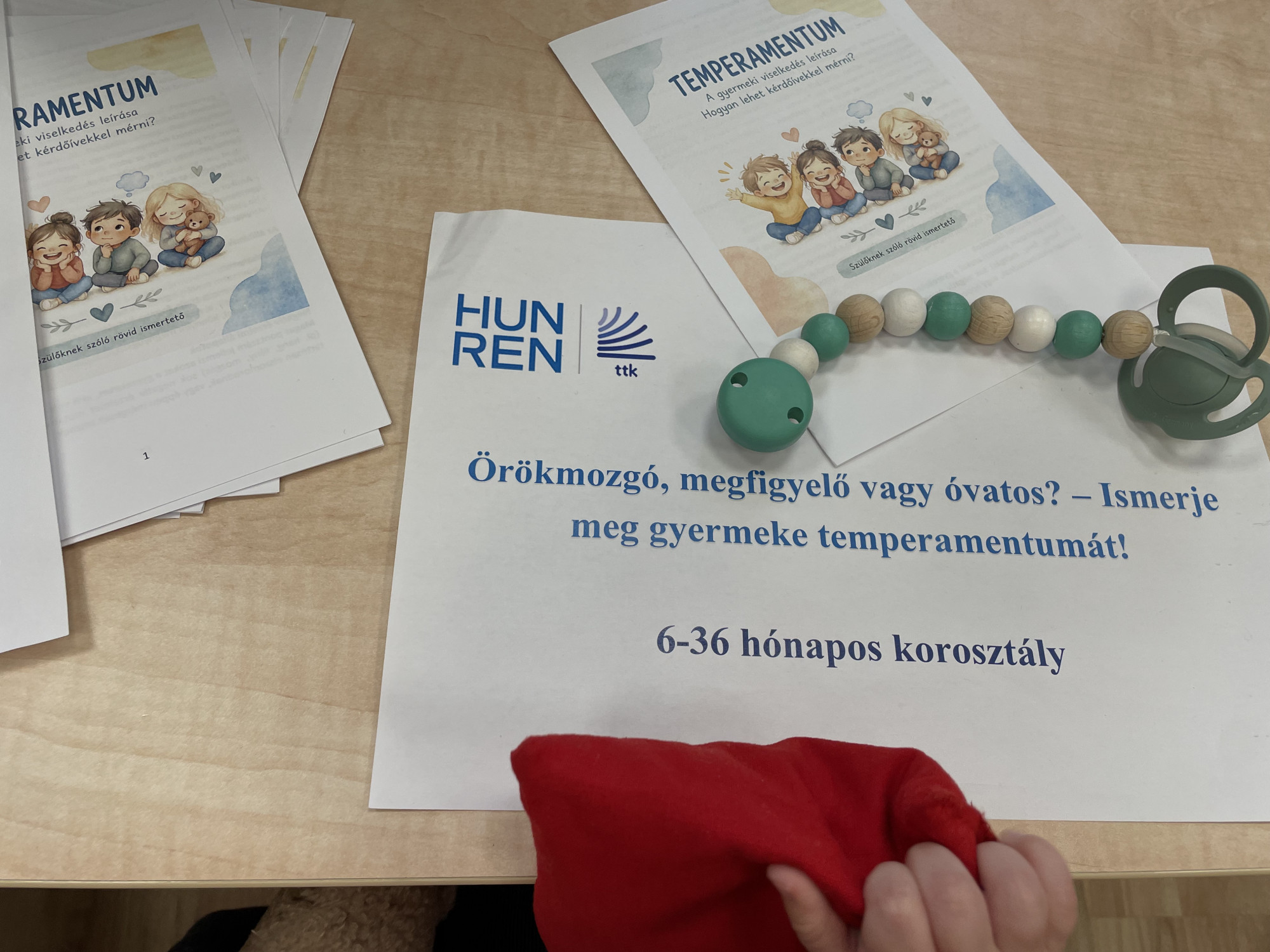 A HUN-REN TTK standján más játékos tesztek mellett azt lehetett megtudni, hogy egy csecsemő vagy egy kisgyermek milyen temperamentumú. Ehhez egy nemzetközi, validált temperamentumkérdőívet kellett kitölteni, az eredményből pedig az látható, hogyan helyezkednek el az adott gyermek viselkedésének jellemzői az életkorának megfelelő mintából álló átlaghoz képest. Örökmozgó, vagy nyugodt, szemlélődő? Képes önszabályozásra? Hogyan éli meg a negatív érzelmi állapotokat? A kutatók szerint más környezeti tényezők és demográfiai adatok mellett a temperamentum összefüggésben áll a korai nyelvi fejlődéssel, ezért érdemes lehet ránézni, hogy egy baba mennyire temperamentumos.