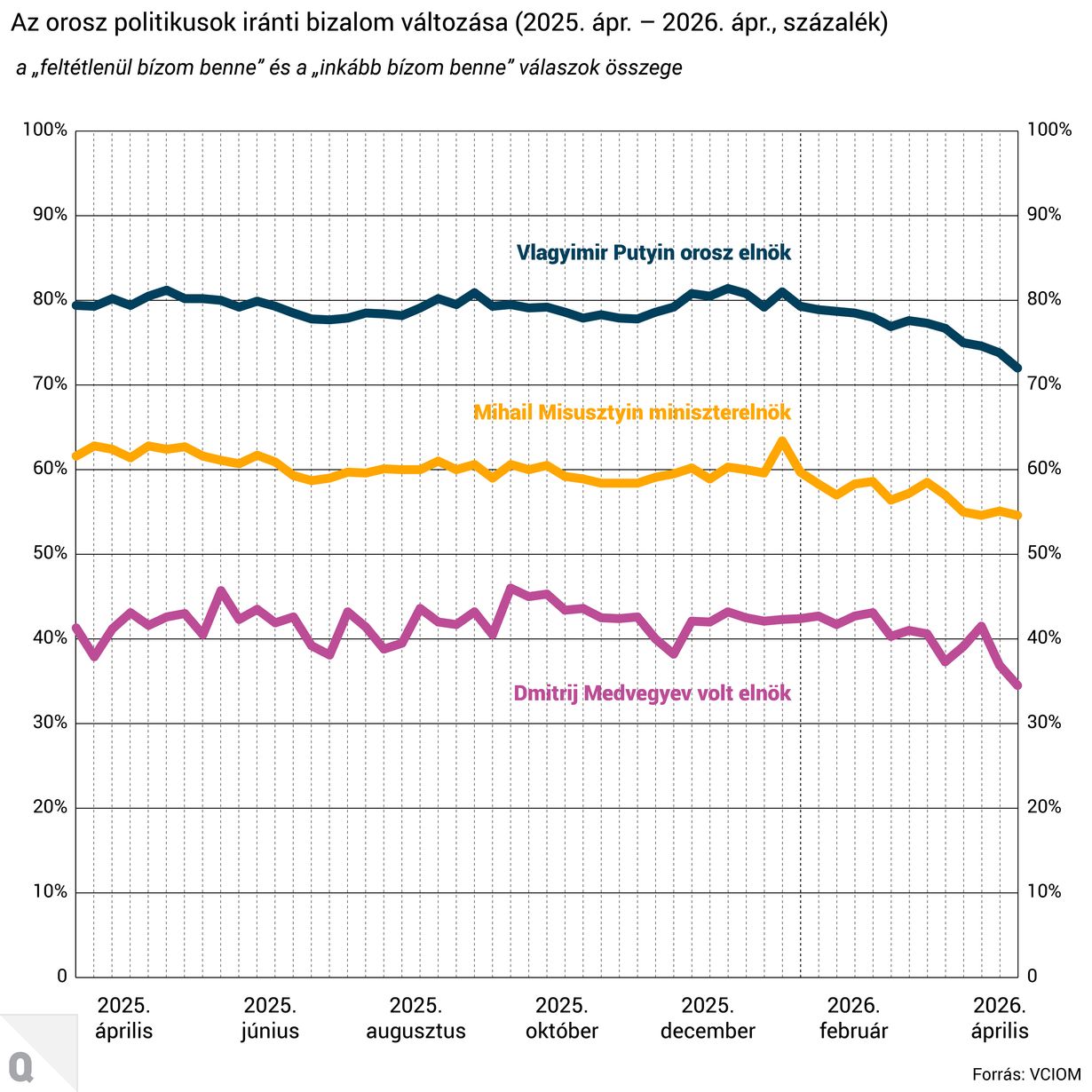 Létezik azonban egy másik kutatási módszer is, amikor a válaszadóknak kell megnevezniük azokat a politikusokat, akik iránt a legnagyobb bizalmuk van. Amikor ezzel a nyitott kérdésfeltevéssel mérik a politikusok támogatottságát, jóval alacsonyabb eredmények születnek. A VCIOM mérése szerint míg tavaly nyáron a megkérdezettek 38,1 százaléka fejezte ki Putyin iránti bizalmát, most áprilisban már csak 29,5 százaléka. A Kreml égisze alatt működő kutatóintézet mindkét módszerrel hónapról hónapra azt mutatja ki, hogy fogy az elnök iránti bizalom.